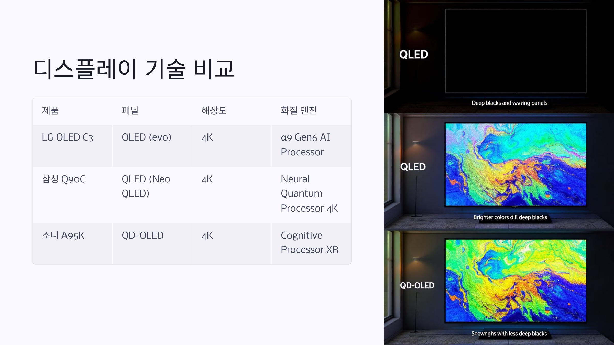 LG OLED C3의 장점은 빠른 반응속도와 블랙 표현력입니다. 반면 단점은 밝기가 QLED보다 낮습니다. 삼성 Q90C는 밝고 생생한 화면이며 단점으로는 약간의 빛샘이 존재한다는 것입니다. 소니는 PS5와 환상적 연동과 사운드가 장점이고 단점은 가격과 밝기 극대화가 아쉽다는 평가 입니다.