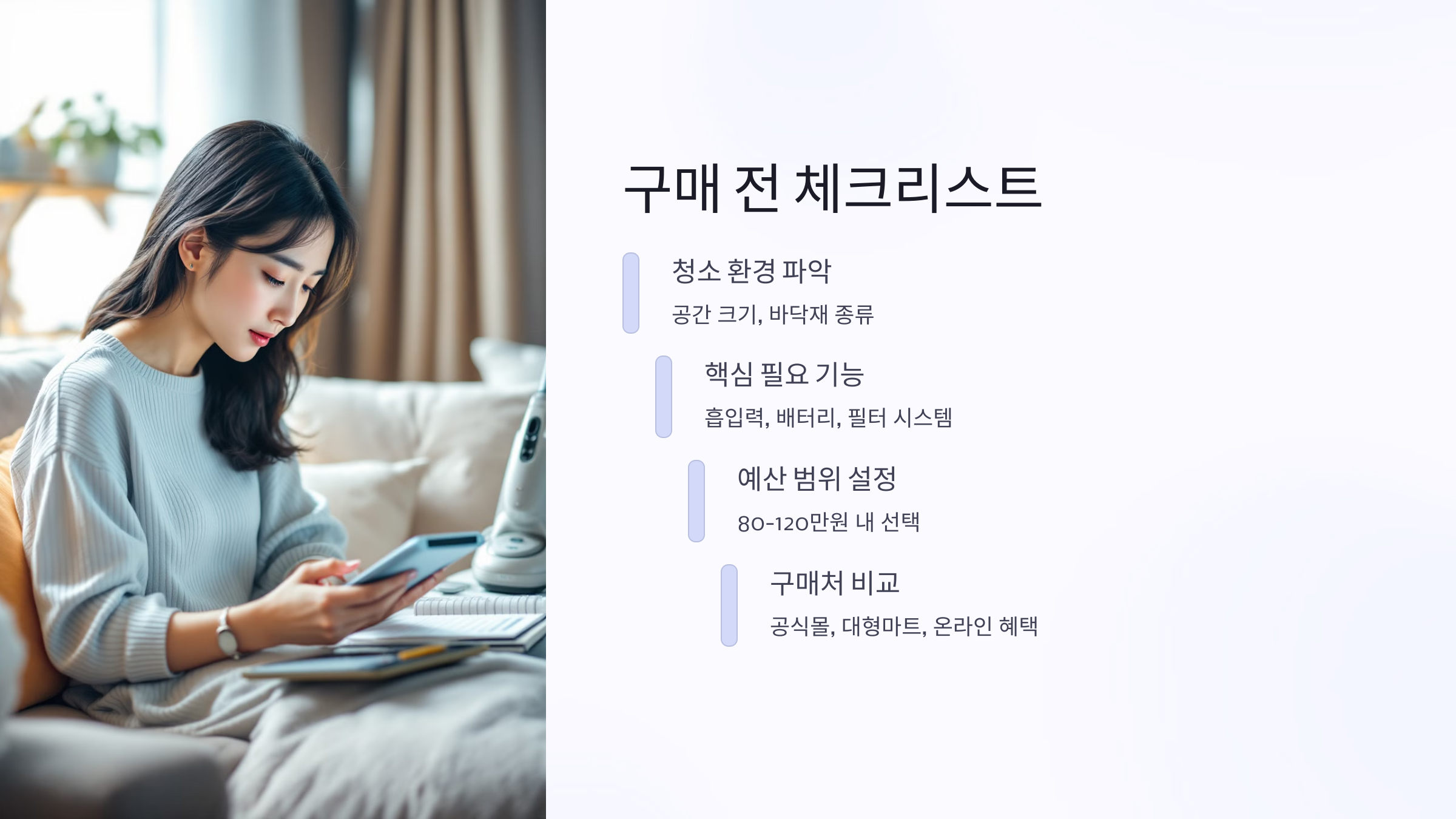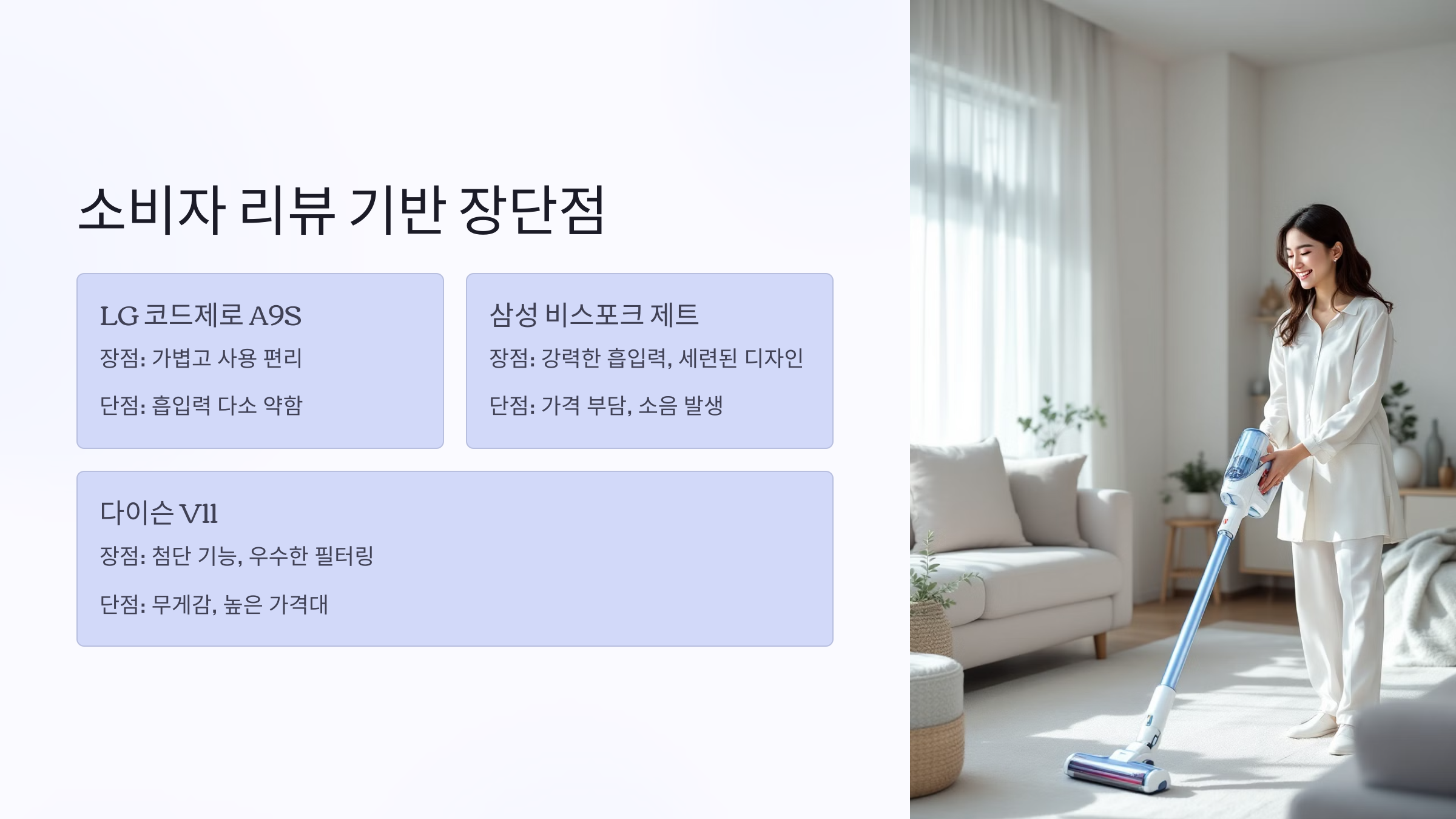 LG, 삼성, 다이슨 모두 각각의 장점이 분명한 프리미엄 무선청소기입니다. 흡입력, 무게, 유지보수, 디자인 취향, 예산을 기준으로 자신에게 맞는 모델을 선택하신다면 후회 없는 소비가 될 것입니다.