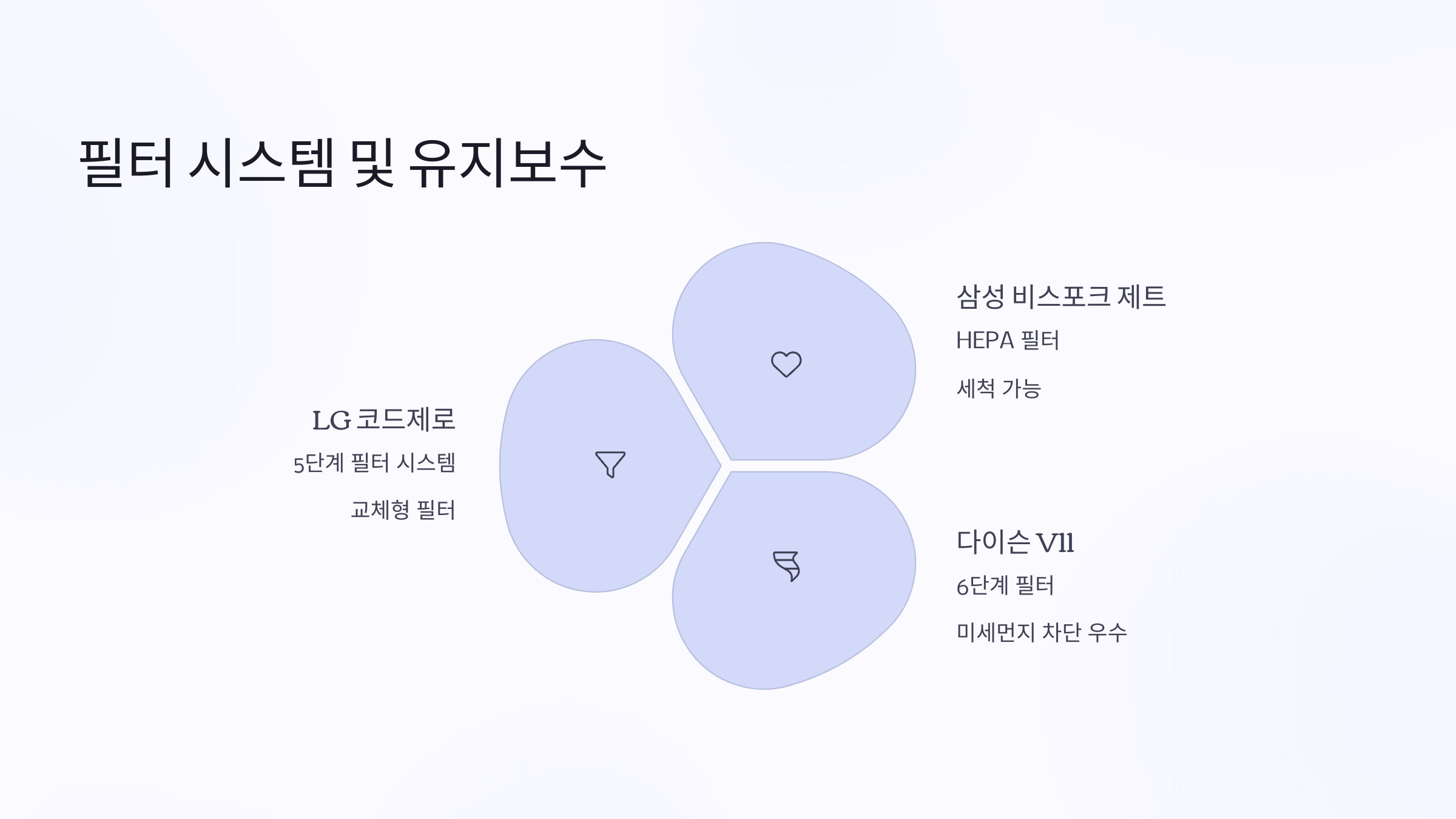 ✔ 세 제품 모두 필터 세척 가능해 유지비 절감하며 ✔ 다이슨은 미세먼지 차단에 탁월한 여과 시스템 제공합니다.