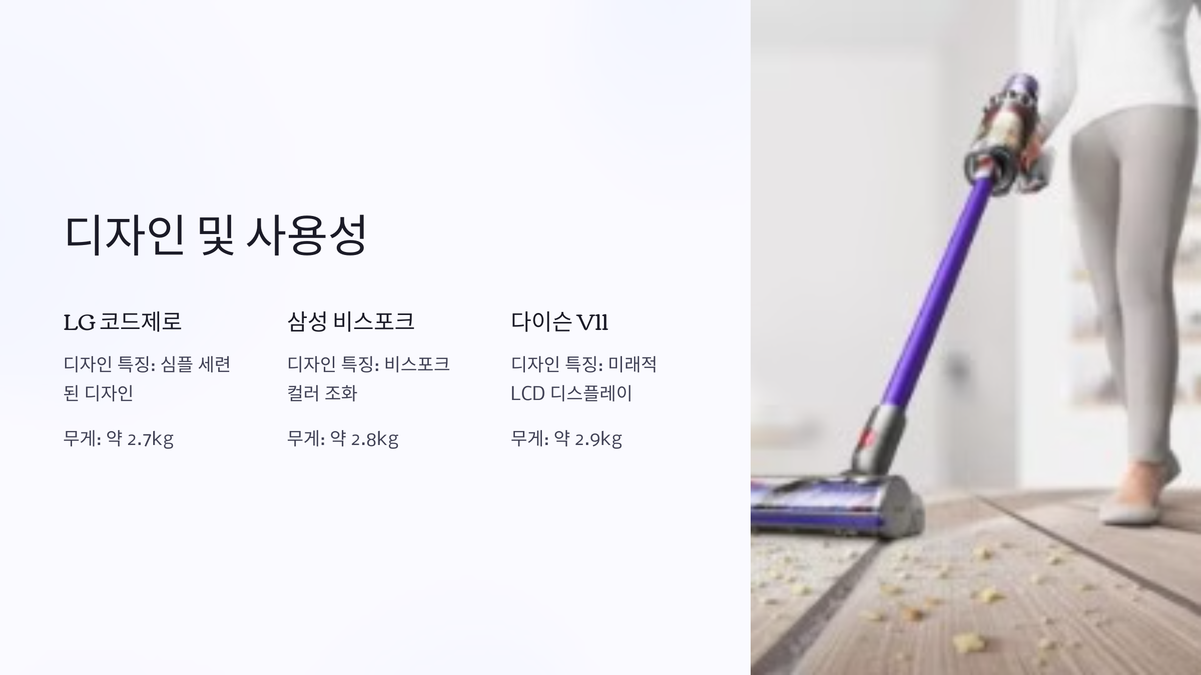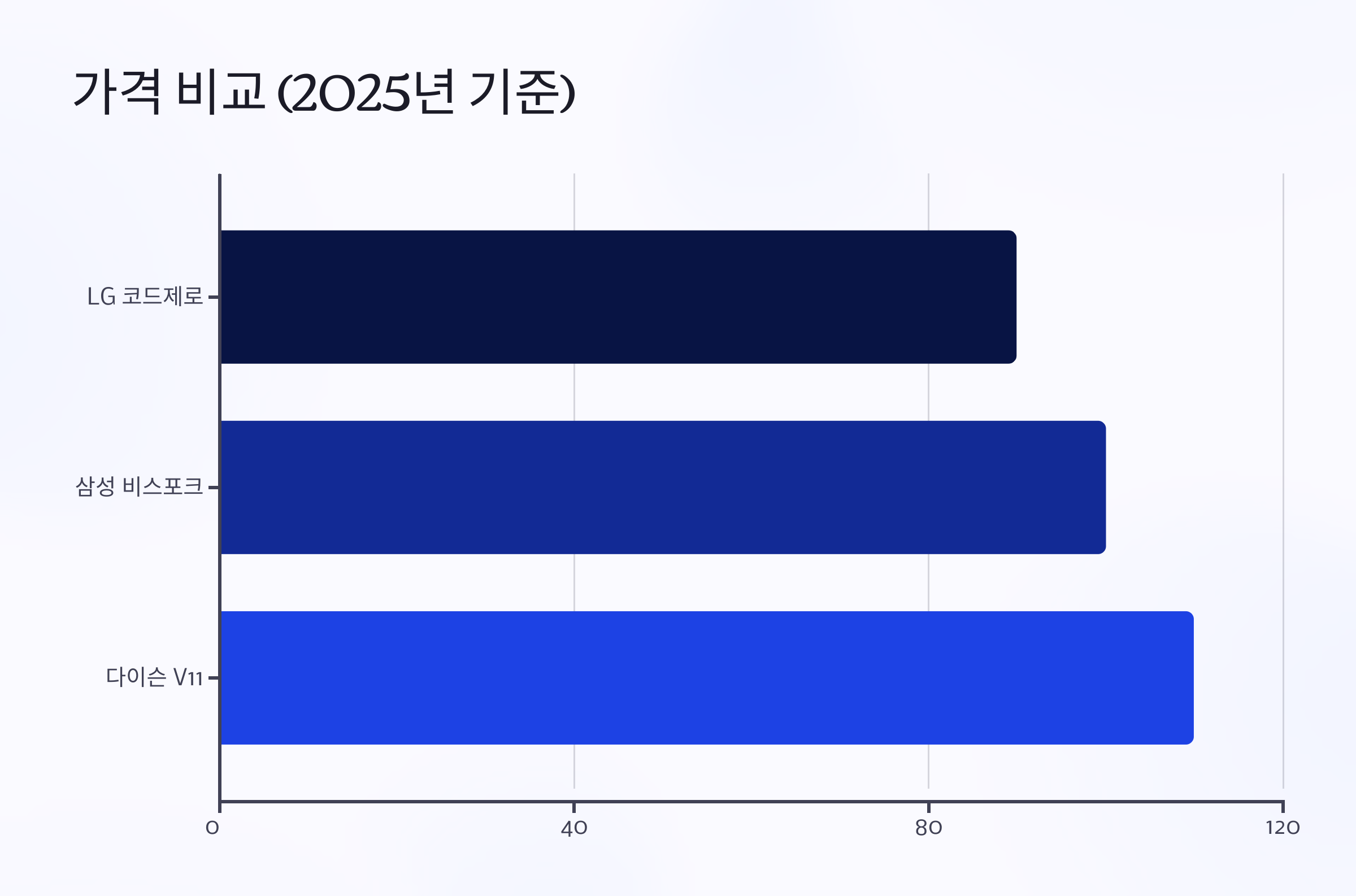 ✔ LG는 가성비 측면에서 우수하며 ✔ 다이슨은 가장 고가이나 프리미엄 기능과 브랜드 이미지 강조합니다.