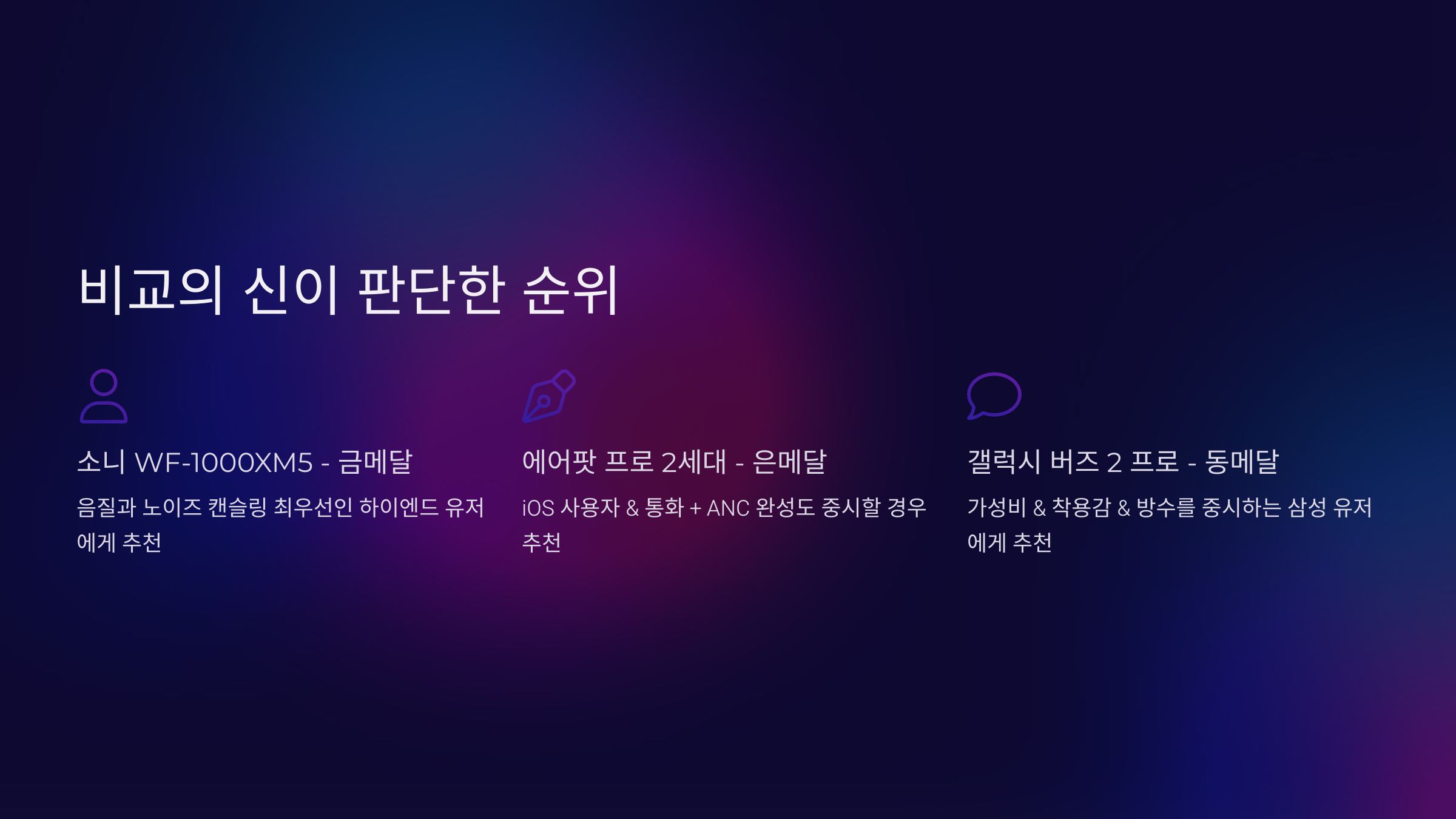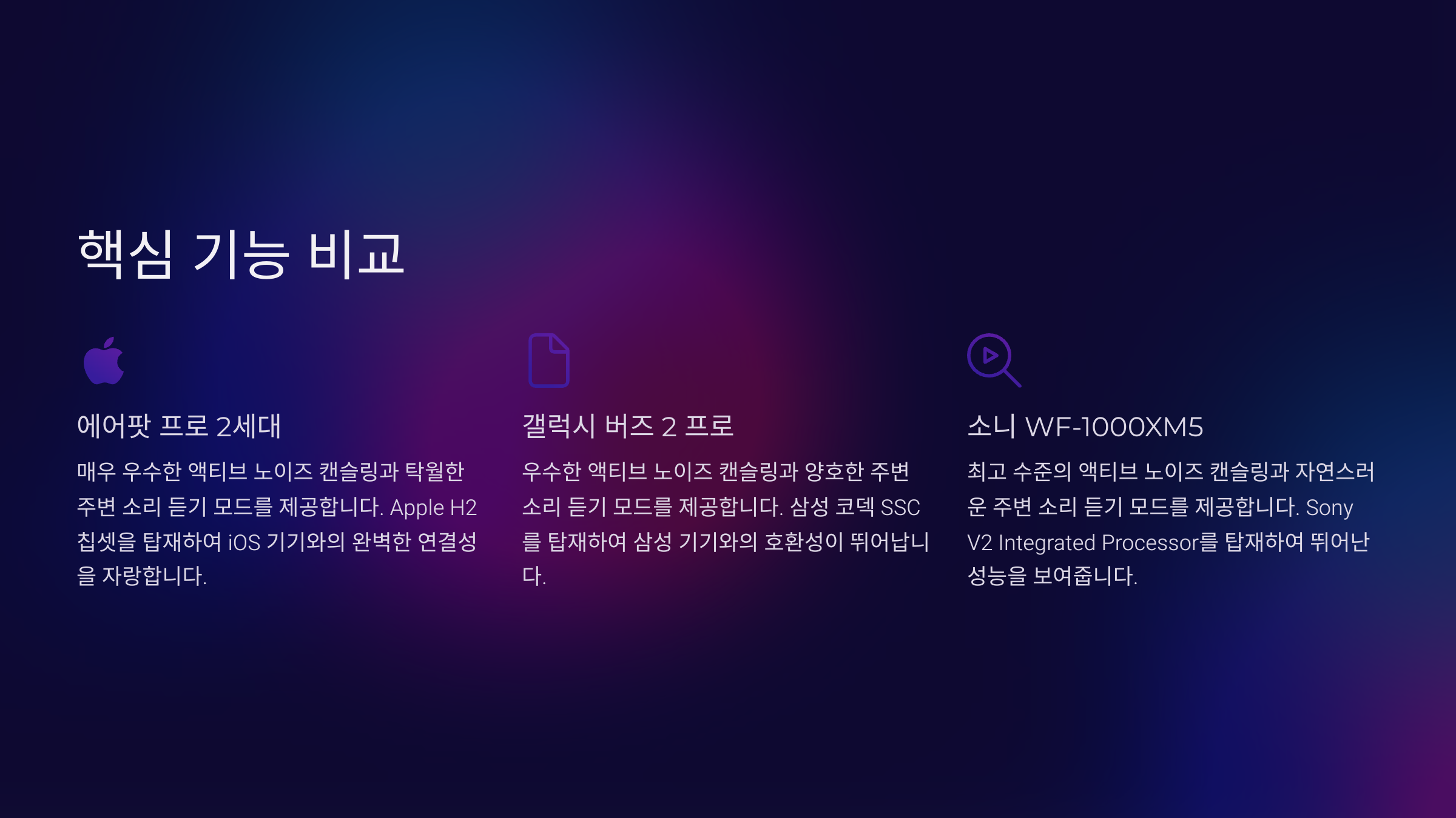 이번 프레젠테이션에서는 이 세 제품의 기능, 착용감, 음질, 배터리, 가격, 소비자 리뷰 기반 장단점을 비교하여, 당신에게 가장 잘 맞는 무선 이어폰을 제안합니다.